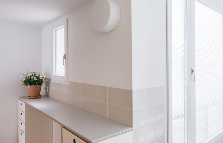 Esta reforma integral de vivienda con dos dormitorios, llevada a cabo por el estudio MINIMO, pone especial atención a las zonas más recurrentes del hogar, como cocina o baño, dando como resultado un espacio versátil y funcional en el que la luz recorre todos los rincones de la vivienda. Para ello, se han utilizado materiales que potencian esa iluminación, como es el caso de las ventanas con el sistema KÖMMERLING76 MD Xtrem.